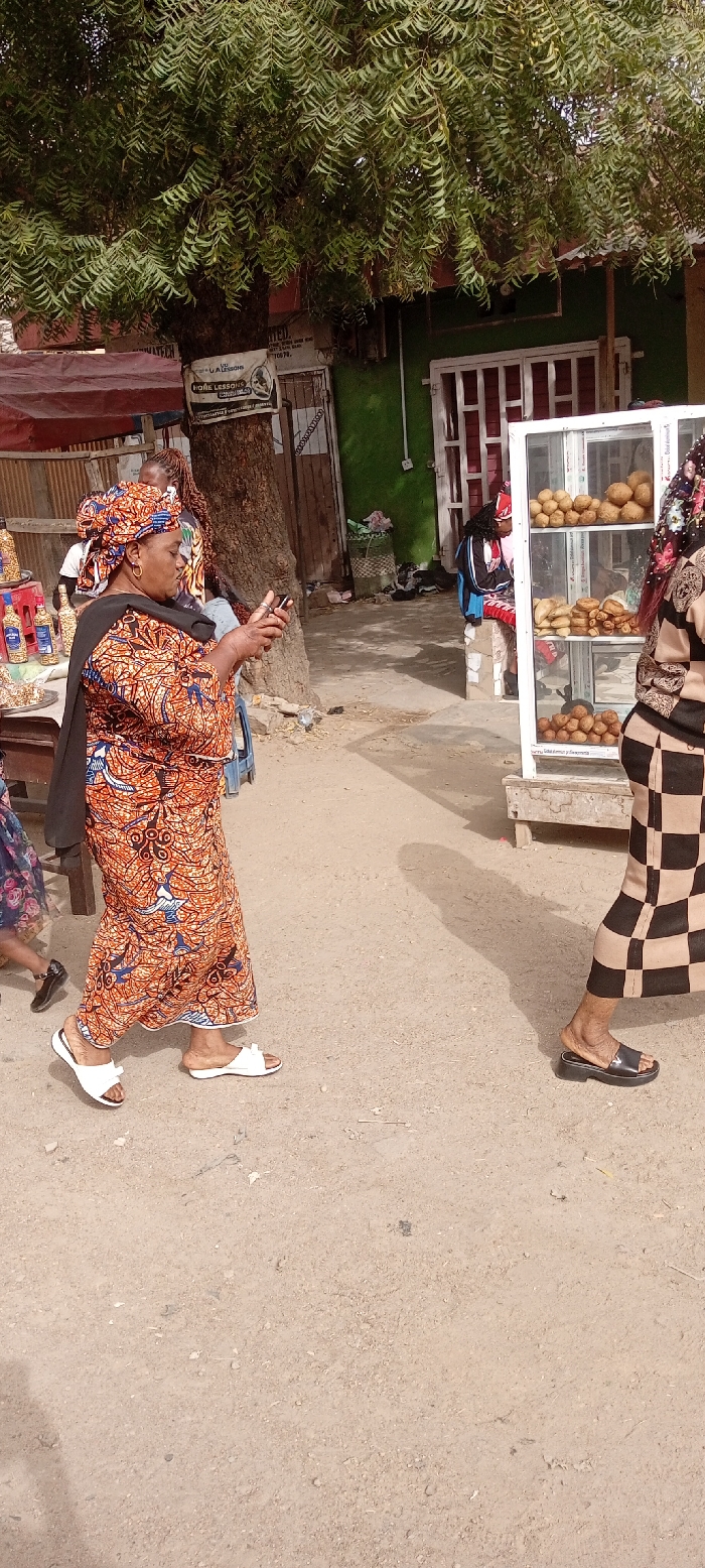 A street scene in Sabon Gari East, Nigeria, depicts an outdoor commercial environment under direct sunlight. The ground is unpaved, consisting of light brown dirt with scattered debris. A woman is walking from the left toward the right of the frame, wearing a long, orange and blue patterned dress, a matching headwrap, and a black shawl. She is wearing white slide sandals and holding a black mobile phone with both hands at chest level, appearing to operate it. Her left arm is slightly bent, holding the phone. To the right, partially visible, another individual walks away from the camera, wearing a brown and black checkered long skirt or dress and black slide sandals. In the midground, on the right, a white-framed glass display case, resting on a wooden stand, exhibits multiple tiers of baked goods or snacks, including numerous round, light-brown items and elongated rolls. Behind the pedestrians, a large tree with dense green foliage occupies the left side of the frame. A white sign, partially legible, reading "U.A LESSONS HOME LESSONS," is attached to the tree trunk. To the right of the tree, a rudimentary stall displays small bottles and a pile of what appears to be groundnuts or similar produce. Further back, a vibrant green-painted building with white-framed windows and doors is visible. Another person is seated near this green building, partially obscured by the display case. The overall scene indicates an active street or market setting.