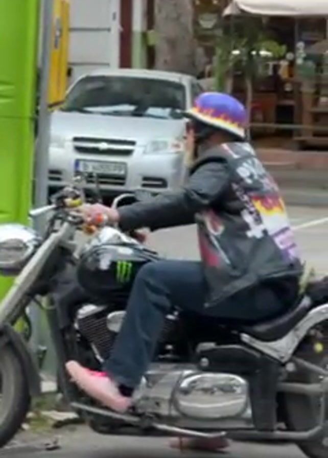A man with a long white beard rides a black motorcycle on a city street. He wears a leather jacket with graphic patches on the back, blue jeans, and bright pink shoes. He also sports a blue helmet with a flame design. The motorcycle has a Monster Energy logo on the tank. The man pauses on the motorcycle and looks towards the camera. In the background, there are parked cars, buildings, and a green advertising structure.