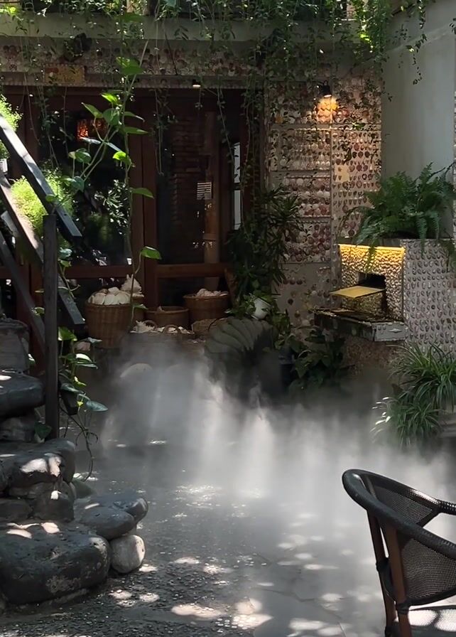 charming outdoor patio area with a mystical, fog-filled atmosphere