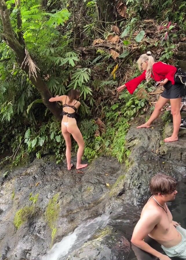 tropical outdoor scene with three people. In the bottom foreground, a shirtless man is half-submerged in a pool of water, looking to his left. To the left of the pool, a woman in a black bikini stands on a mossy rock surface, using a small tree branch for balance. To her right, standing on a higher rocky outcrop, is another woman with blonde hair, wearing a red long-sleeved shirt and a short black skirt. She's reaching out with her right hand towards the woman in the bikini, seemingly offering assistance. The background is filled with lush, dense tropical foliage. A small waterfall cascades into the pool. The overall atmosphere is natural and adventurous.