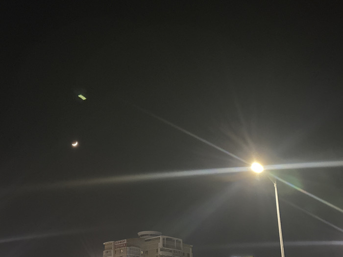 A crescent moon and a rectangular green light punctuate a dark night sky. Below, a multi-story building is barely visible, its upper levels distinguished by a rounded roof. A bright street lamp dominates the right side of the frame, emitting strong light beams that create a hazy glow around it. The rest of the scene is dark and indistinct.