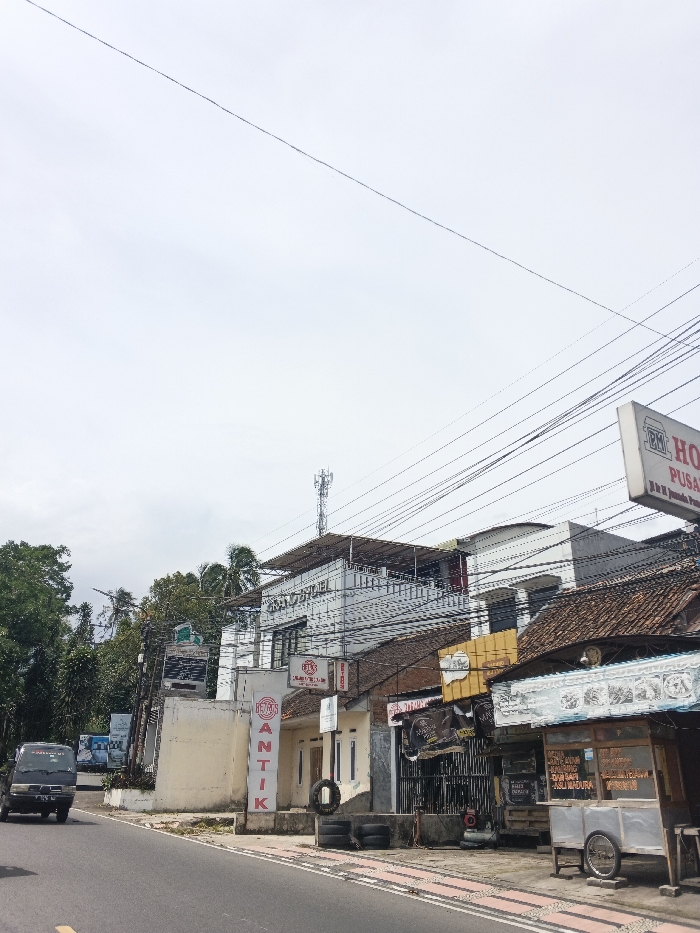 A street scene shows a vehicle driving on the left side of the road. The right side of the road features buildings and businesses. A sign that reads "ANTIK" is visible on the front of a building. Several signs hang from the buildings. There is a small stall with a pushcart attached to it on the right side. The sky is overcast and numerous power lines run through the scene.