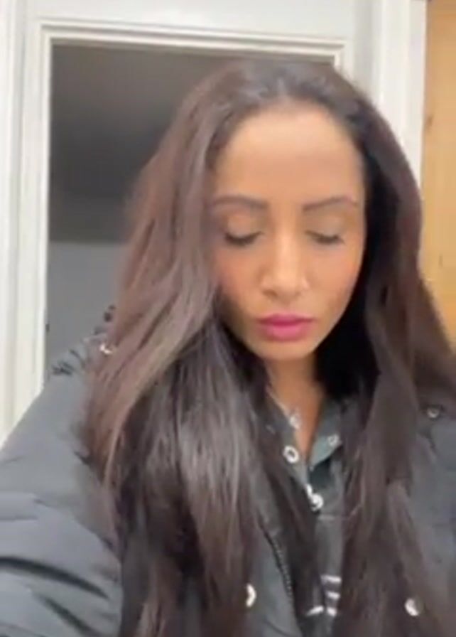 A woman with long, dark hair, wearing a black puffer jacket and a grey shirt with white writing, stands in what appears to be a hallway. The background includes a white door frame and a partially visible wooden door on the right. The woman is looking directly at the camera and puckering her lips.
