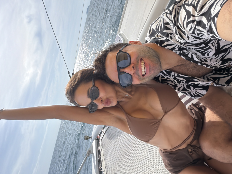 A selfie photograph depicts an adult male and female on a catamaran at sea, offshore from Rawai, Thailand
