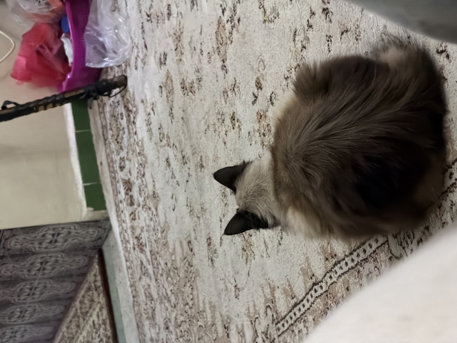 A fluffy, brown and tan cat sits on a patterned carpet. The cat's rear is prominent, with its head turned to the left, ears perked. In the background, parts of a staircase with an ornate design and white wall with green trim are visible. A black object sits near red and clear bags and plastic wrappers.