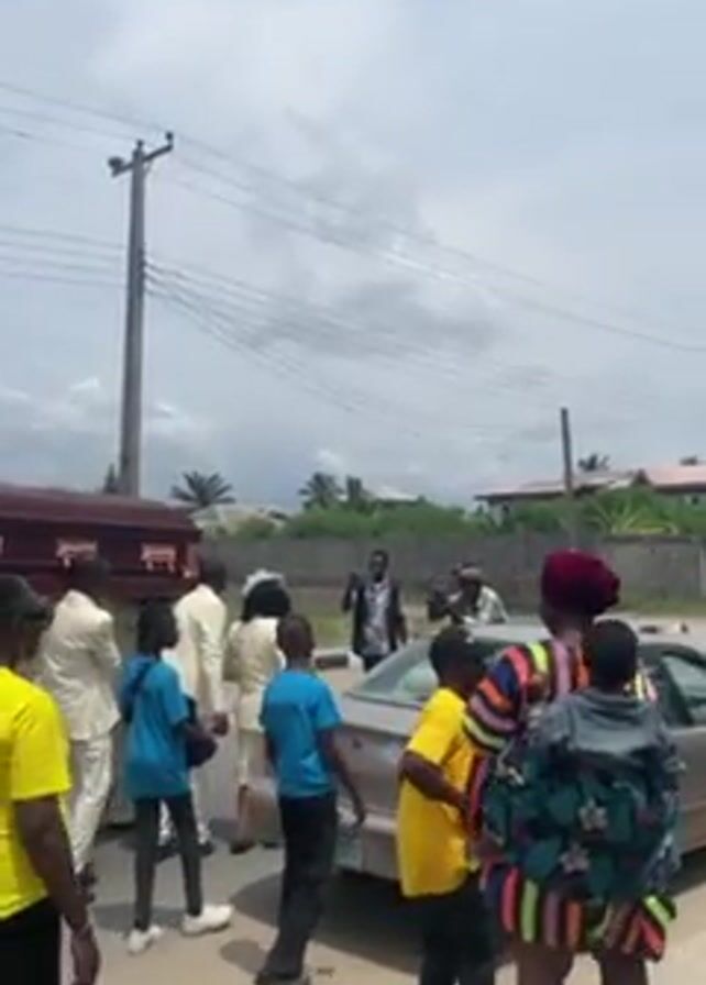 funeral procession taking place on a street. Pallbearers, dressed in white suits, carry a dark, ornate casket. Mourners dressed in a variety of brightly colored clothing, including t-shirts with memorial messages, walk alongside and behind the casket. The procession passes by houses and a parked car. Music plays in the background. The sky is overcast.