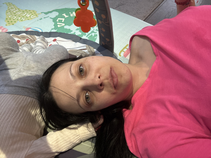 An adult female, estimated to be between 20 and 40 years old, with dark hair and light-colored eyes, is depicted lying on her back, gazing directly at the camera. She is wearing a fuchsia-pink long-sleeved top. To her immediate left, an infant is partially visible, with only its lower torso and legs shown, dressed in a light grey full-body romper and grey-and-white striped socks. Both individuals are situated on a light blue baby playmat, which features a world map design with visible continent labels such as "SOUTH AMERICA" and "AFRICA," and is bordered by a dark grey edge. An orange monkey-shaped toy is suspended from a dark-colored baby gym arch, partially visible above the playmat. A cream-colored ribbed garment is visible beneath the adult female's head and shoulder area, extending partially over the infant. The background includes a light-colored rug and flooring elements. The precise location within the city of Pernik, Bulgaria, is not discernible from the image.