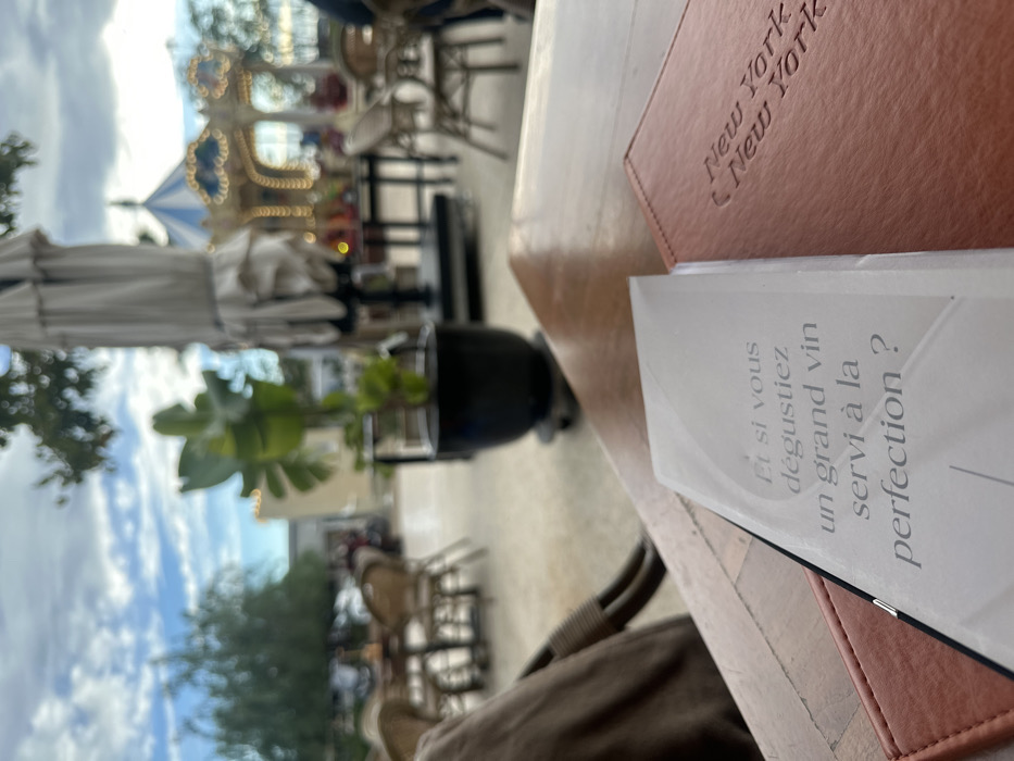 The image depicts a first-person perspective from an outdoor café table on the Allées de la Liberté in Cannes, France. The foreground features a light-colored wooden table with two menus. The menu on the left is white with the French text "Et si vous dégustiez un grand vin servi à la perfection?" The menu on the right is reddish-brown, embossed with "New York New York." A partial view of a light brown garment, likely belonging to the seated individual, is visible on the far left. The midground, out of focus, shows an outdoor dining area with light-toned paving. Multiple empty wicker-style chairs and tables are arranged. A large black planter containing a green plant and the base of a retracted outdoor umbrella are present. The background, also out of focus, reveals a public square under a partly cloudy sky. A brightly lit carousel with a blue and white striped canopy and golden decorations is prominently visible. Additional outdoor seating and tables, trees, and distant buildings complete the environment. No specific individuals or their actions are discernible due to the shallow depth of field.