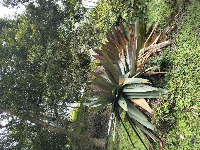 A vibrant green and brown plant is centrally located on a grassy terrain, slightly angled. The plant is surrounded by green vegetation with patches of moss. The background features lush trees with dense foliage, partially obscuring a glimpse of the sky. The overall setting is reminiscent of a tropical or subtropical garden.