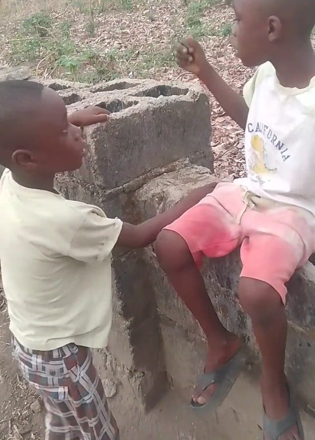 Two young boys are playing on and around a large rock or concrete structure in an outdoor environment. One boy wears a white t-shirt with "California" printed on it and pink shorts, while the other boy wears a light-colored t-shirt and plaid pants. They are interacting closely, possibly engaging in a physical game or play. The ground appears to be a mix of dirt, loose debris, and some vegetation. In the background, glimpses of buildings or structures can be seen.