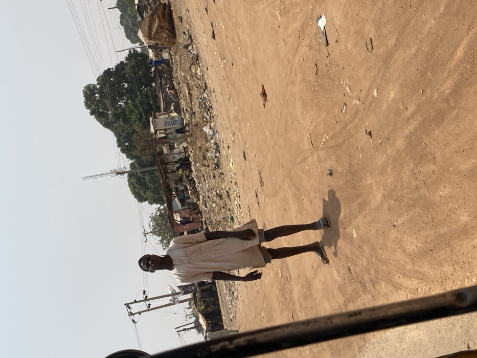 The image depicts an outdoor scene in Katcha, Nigeria, under clear daylight. A young Black male stands prominently in the center foreground on an unpaved, reddish-brown dirt surface, facing directly towards the camera with a neutral expression. He wears a light-colored, knee-length tunic over dark shorts, with light-colored flip-flops on his feet. His arms are relaxed at his sides. The background reveals a bustling, somewhat cluttered environment. Immediately behind the subject, a substantial quantity of assorted trash and debris is scattered across the ground. Further back, several simple market stalls or shelters constructed from wood, corrugated metal, and tarps are visible. Multiple indistinct figures are present near these structures. Above, numerous utility poles support an array of power lines, and a tall metal telecommunications tower is discernible in the distance. Lush green trees are visible beyond the structures and infrastructure. On the far right side of the background, a large, raw wooden log or tree trunk rests on the ground. The far left foreground is partially obscured by a dark, vertical metal bar, possibly part of a vehicle's frame. Tire tracks are visible on the dirt surface.