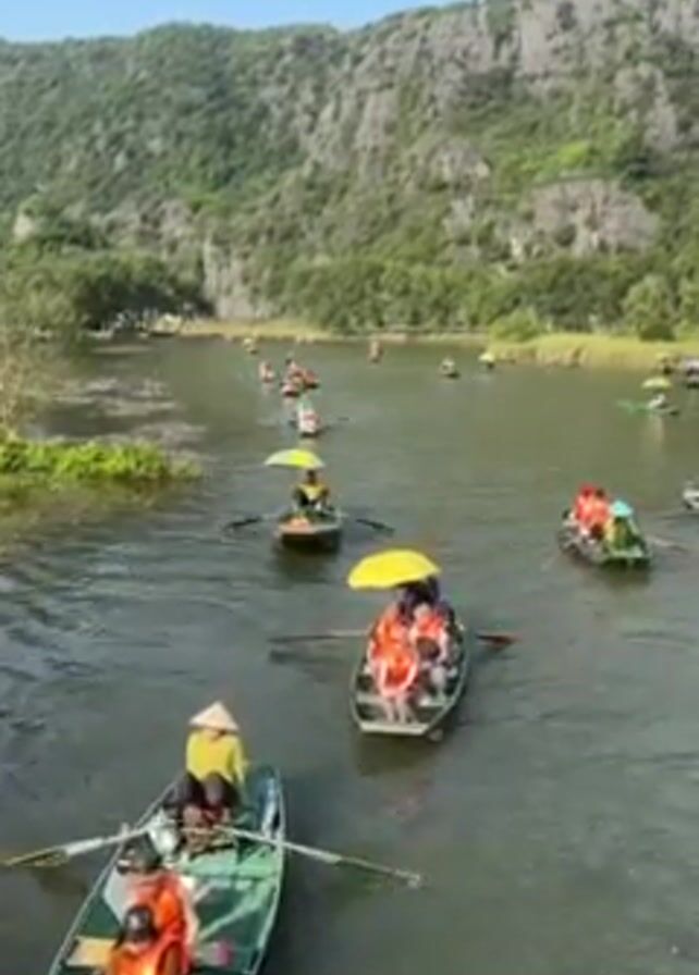 busy river scene with numerous small rowboats moving along the waterway. The boats are filled with people, many wearing orange life jackets and some shaded by colorful umbrellas. The boat operators wear traditional conical hats. The surrounding environment features lush green trees and rocky, mountainous landscapes. The water is calm, with slight ripples from the boat movement. The sky is clear and bright, suggesting a sunny day. The camera position is elevated, providing an overview of the river traffic.