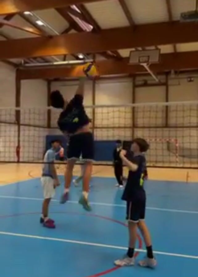 volleyball training session inside a gymnasium with a wooden ceiling structure and skylights