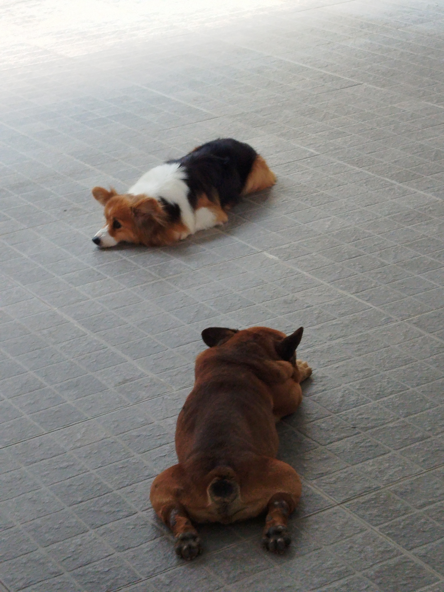Two dogs are lying on a tiled floor