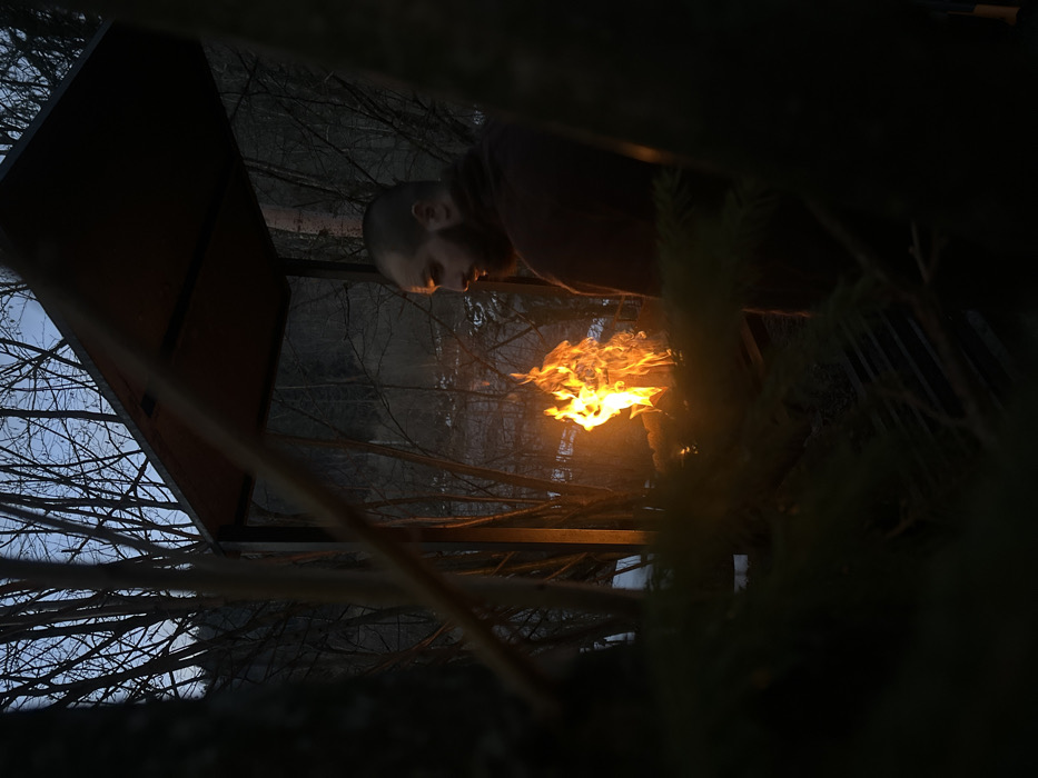 In an outdoor setting in Korostiv, Ukraine, captured at dusk or night, a male individual with a beard and short dark hair is depicted in profile, facing right. He wears dark clothing and stands to the right of a large, brightly burning fire. The fire, characterized by intense orange and yellow flames, is contained within a dark metal structure topped with a square canopy, under which the man is partially positioned. The firelight illuminates the man's face and the immediate surroundings. Behind the man and the fire, a natural environment is visible, featuring numerous bare deciduous trees silhouetted against a pale blue-grey twilight sky. Patches of snow are present on the ground, and a darker, dense forest or hillside recedes into the distance. The immediate foreground is partially obscured by dark, out-of-focus tree branches and needles.