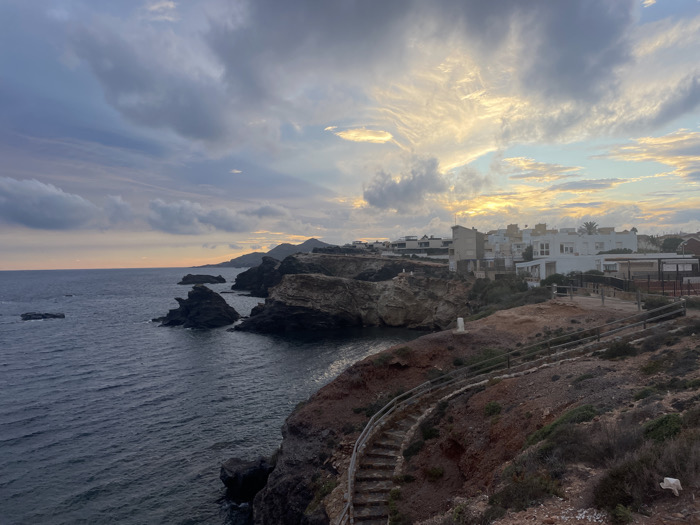 The image displays a coastal scene in Cartagena, Spain, captured under low light, indicative of either sunrise or sunset. The upper portion features a sky with dense grey clouds on the left transitioning to scattered, wispy clouds in the center and right, where they are illuminated by a golden-orange glow from a low sun. The dark blue-grey sea occupies the lower-left, exhibiting moderate surface ripples and several dark, jagged rocky outcroppings or sea stacks. The right side of the frame is dominated by steep, dark brown and grey rock cliffs, showing signs of erosion, that descend abruptly into the water. The cliff tops are covered with sparse, reddish-brown earth and low-lying scrub vegetation. In the foreground-right, a winding unpaved path or set of stone steps, accompanied by a weathered wooden handrail, descends along the cliff face. A white marker post is visible near the path. White plastic detritus is present on the far bottom right edge of the path. In the mid-ground right, a cluster of light-colored residential buildings with various roof structures is situated on the elevated land above the cliffs. Adjacent to these structures, a fenced area consistent with a tennis court is discernible. Dark mountainous terrain is visible along the distant horizon, extending from the coastline. No individuals or active interactions are depicted.