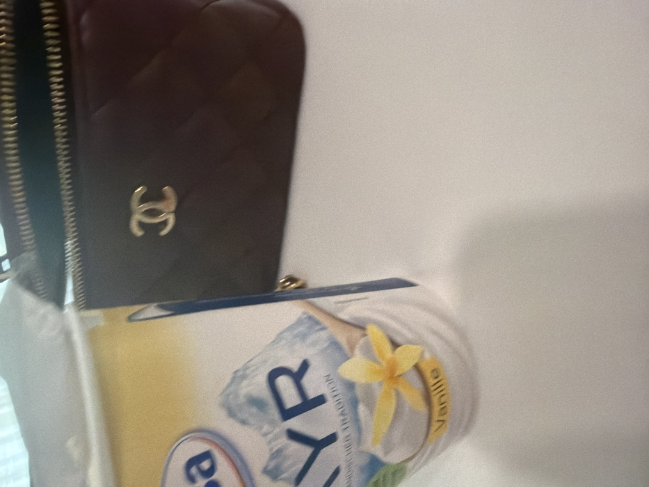 The scene, presented as being located in Varna, Bulgaria, depicts two primary objects resting on a flat, light-colored surface, likely a table or countertop. In the foreground on the left, an open "skyr" yogurt container is partially visible. The container is white with blue and black lettering, featuring a graphic of snowy mountains, a wooden spoon, and a vanilla pod with a flower, indicating a "Vanille" (vanilla) flavor. The container's foil lid is pulled back, revealing its underside. To the right and slightly further back, a dark burgundy or deep brown quilted pouch or wallet is present. It features a prominent gold-colored interlocking "C" logo on its front surface, consistent with the Chanel brand. A metallic zipper closure is visible along the top edge of the pouch, and a segment of a gold-colored chain or strap attachment is discernible on its left side. The surface beneath the objects is uniform, white or light gray, with soft ambient lighting producing subtle shadows. No individuals or active interactions are visible in the frame.