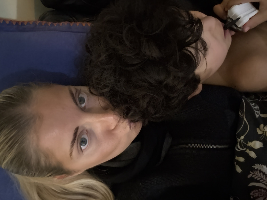 Two individuals are visible in the image, one with blonde hair and the other with dark, curly hair. The blonde person is looking directly at the camera. A person with dark hair is lying down as someone uses a nail clipper on their lip. They appear to be reclining on a blue surface. The photo's composition has the subjects in a horizontal orientation.
