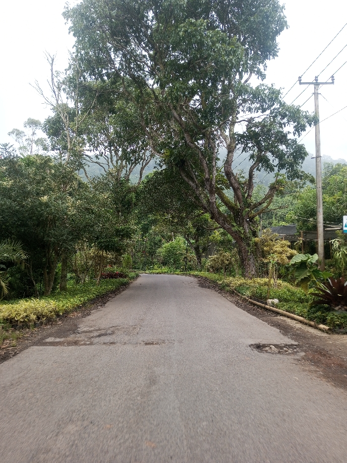 A straight, narrow asphalt road leads through a dense, green landscape. Tall trees with heavy foliage form a canopy overhead, casting shadows on the road. Lush vegetation lines both sides of the road, with a variety of plants and bushes. A utility pole with electrical wires stands to the right of the road. The road surface shows some wear and minor damage. The overall impression is of a peaceful, natural setting.