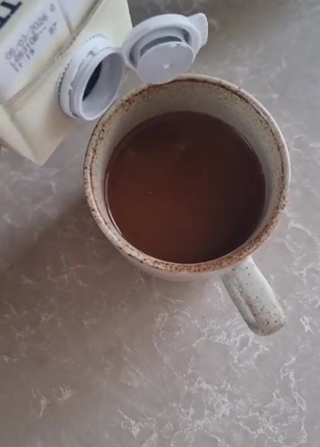 - "From a high-angle perspective, a hand pours a stream of white liquid from a carton labeled “AMALATTEA” into a mug of dark brown coffee" by FM-eDsUh1, licensed under CC BY 4.0