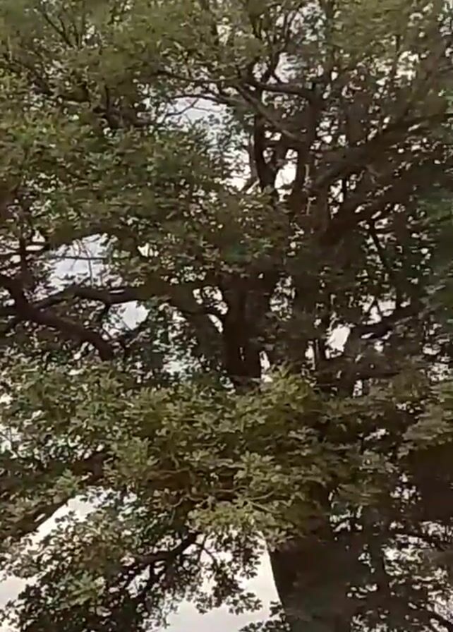The video pans out from a close-up of a large tree with green leaves to a wider shot revealing its surroundings. The tree stands in a dusty, open area with some simple structures and a smaller, pointed tree nearby. A utility tower can be seen in the background, and the sky is partly cloudy. The overall impression is of a rural or semi-urban scene.