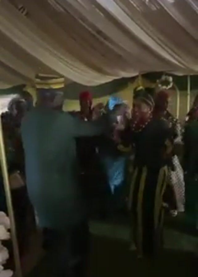 group of people dancing together at an event. The setting appears to be under a tent with off-white and green draped fabric. Several women are dressed in colorful outfits, some wearing head coverings. A man in a dark green suit and a patterned hat dances alongside them. Other people are visible in the background, watching and participating in the celebration.