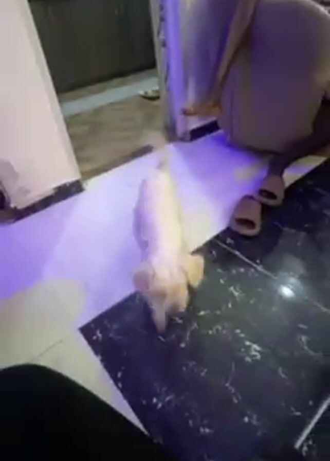 A small white dog walks around a room with tiled floors. Two people are visible, one sitting on a couch and one sitting on the floor. The dog walks near the person sitting on the couch, and they reach down to pet the dog. A plate of food is on the floor. The room is illuminated with blue lighting.