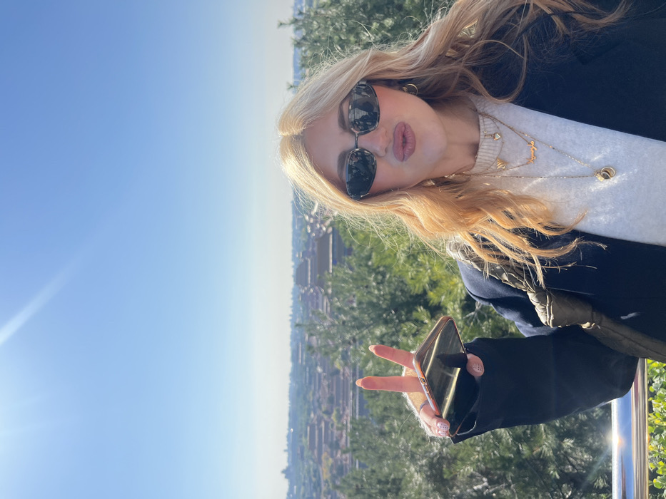 female individual taking a selfie outdoors from an elevated viewpoint overlooking the Forbidden City in Xicheng District, Beijing, China. The subject, positioned in the foreground, has light blonde hair and wears dark oval sunglasses. Her lips are pursed in a "kissing" expression towards the camera. She is dressed in a white long-sleeved sweater under a navy blue blazer, with an olive green bag strap visible over her right shoulder. She wears several gold-colored necklaces, including one with a small heart charm, one with an Arabic or Farsi script pendant, and a longer one with a double-disc pendant. Gold hoop earrings are also visible. Her left hand holds a gold-framed smartphone horizontally, while her right hand displays a "peace sign" gesture. The background features a clear blue sky with a prominent sun flare in the upper left quadrant. Below the horizon, the expansive traditional architecture of the Forbidden City is clearly visible, characterized by its dark and yellow-tiled roofs and numerous imperial structures, partially framed by green trees. Beyond the Forbidden City, a wider urban cityscape extends into the hazy distance. A silver metallic railing is present in the lower left foreground, suggesting an observation deck. The scene is brightly illuminated by direct sunlight.