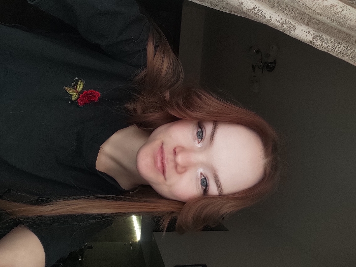 A young Caucasian female with reddish-brown hair and light blue eyes is depicted in a close-up, head-and-shoulders portrait. She is looking directly at the camera with a slight, closed-mouth smile. Her hair is long, parted on the left, and styled with waves framing her face. She is wearing a black long-sleeved top featuring an embroidered red rose with green leaves on the left chest area. The background is an indoor setting, with a light-colored, patterned curtain visible on the upper left, and a dark ceiling with a partial view of a light fixture in the upper center. The remainder of the background is dark and out of focus. The scene is located in the city of Марковский, Russia.
