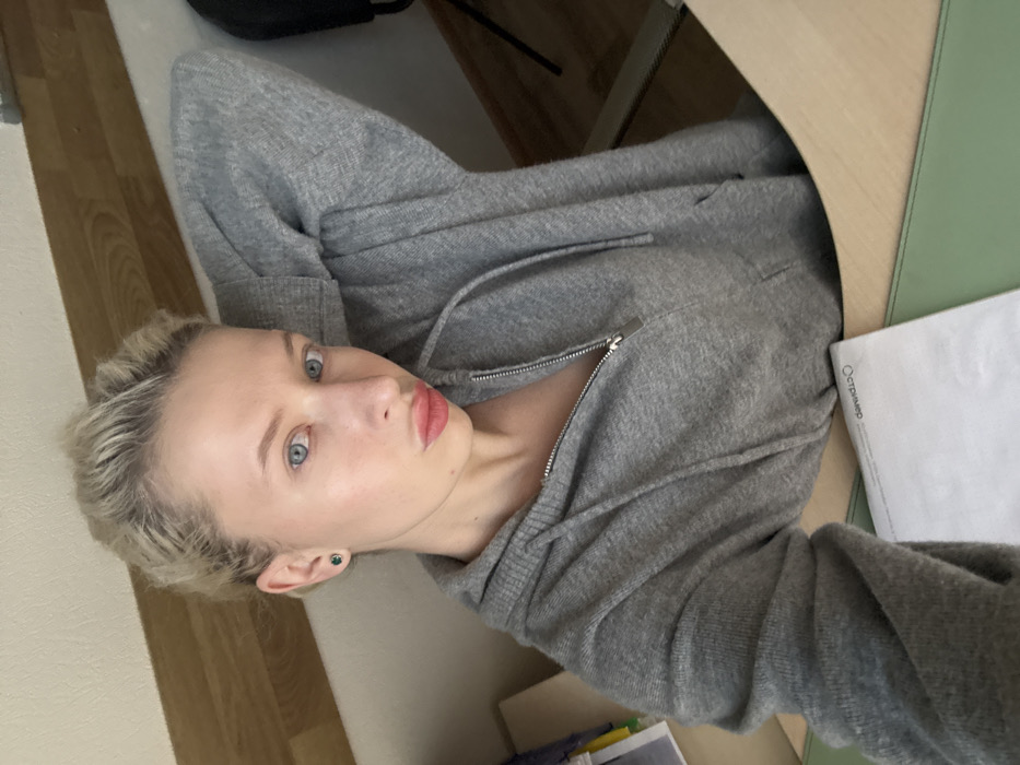 A young Caucasian female, estimated to be in her late teens or early twenties, is centrally positioned, directly facing the camera. Her light blonde hair is pulled back and styled upwards. She has blue eyes, fair skin, and wears small green stud earrings. Her lips are pursed. She is dressed in a grey hooded sweatshirt with a silver zipper, partially unzipped. Her left arm is raised with the hand placed behind her head, while her right arm rests on a light-colored wooden desk. The desk surface features a distinct green inlay. On the desk, a white sheet of paper displays upside-down Cyrillic text. To the left of the subject, stacked documents or books with colored edges are visible. To the right, a dark, vertical object, possibly a tripod leg or backpack, is partially visible against a light-colored wall with a horizontal wooden trim. The scene is situated indoors, in Saint Petersburg, Russia.
