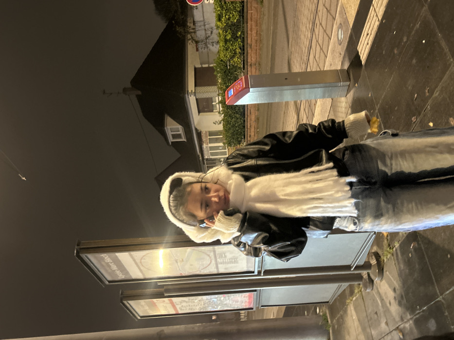 This image depicts a nighttime street scene in Bischheim, France. A young individual stands prominently in the foreground, facing slightly right, engaged in a phone call. The person is wearing a white hooded garment with ear-like protrusions, a long white fringed scarf, a black leather-look jacket, light-wash wide-leg jeans, and light-colored mittens or gloves. A dark-colored smartphone is held to their right ear, while their left hand clutches a small, irregular yellow object, possibly a leaf or flower. To the subject's left are two vertical public transport information panels, one clearly displaying "Lycée Marc Bloch" at the top. To their right, a silver-colored public transport ticket validation machine with a red top is visible. The ground is a dark, wet-looking paved surface, likely a sidewalk or tram stop platform, featuring tactile paving strips for the visually impaired. In the background, beyond a dark roadway, a residential building with a dark, steeply pitched tiled roof and light-colored walls is visible behind a low hedge. The building features brick accents and a prominent dormer window. The sky is dark and overcast, with a faint, elongated light trail, consistent with an aircraft contrail, visible in the upper portion of the frame. The scene is illuminated by artificial light sources, casting visible reflections and shadows.