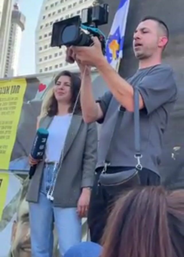man and woman standing on a stage with a camera pointed towards a crowd. The woman is holding a microphone with "News 13" printed on it. She wears a blazer over a white shirt, and light blue jeans. The man is operating the camera. He is wearing a grey shirt, black pants, and a small shoulder bag. Behind them is a banner with a picture of a man on it. Behind the banner, a building is visible. An Israeli flag is flying from the banner. In front of the stage is a crowd of people. A person in the crowd wears a yarmulke. The sky is clear and blue.