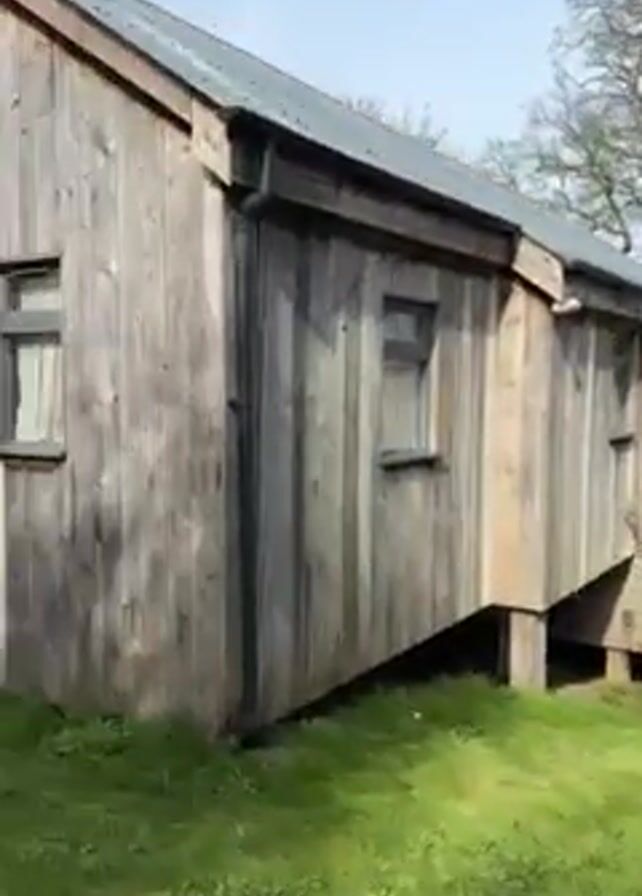 The camera begins pointed at a long, rectangular, single-story wooden building with a gray metal roof, situated on a grassy lawn