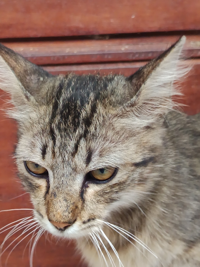 - "A close-up, eye-level forensic view of a domestic tabby cat, located in Maleber, Indonesia" by FM-WRTkH2, licensed under CC BY 4.0