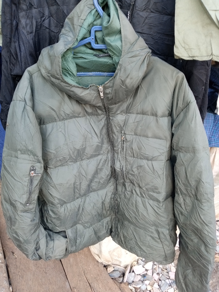 - "A dark olive-green hooded puffer jacket hangs on a blue plastic hanger in an outdoor market setting in Maiburiji, Nigeria" by FM-9Gwob2, licensed under CC BY 4.0