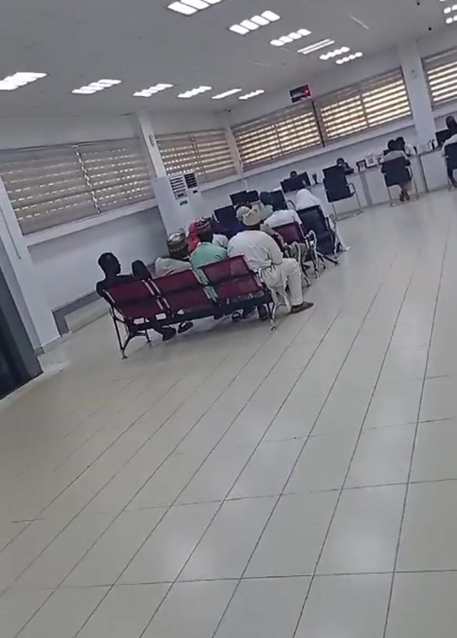 interior of a bank. Several people are sitting on a row of benches, waiting. They are mostly men, and some are wearing traditional Muslim clothing. There are bank tellers working behind counters along the far wall. The room is brightly lit and has a tiled floor. Blinds cover the windows.