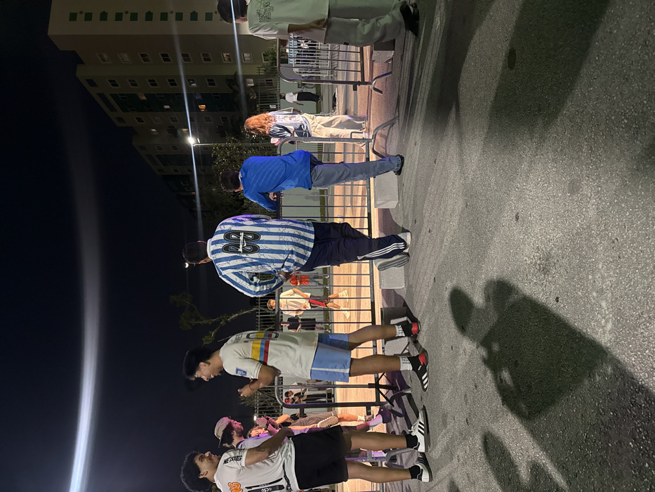 Several individuals line a barricaded walkway outside a tall building at night. The group's clothing includes jerseys with numbers on the back, striped shirts, blue jackets, and casual wear. Many wear Adidas shoes, and some have socks pulled up high. They seem to be watching something in the distance beyond the barricade. The scene is illuminated by streetlights and what appears to be a spotlight. Shadows stretch across the pavement.