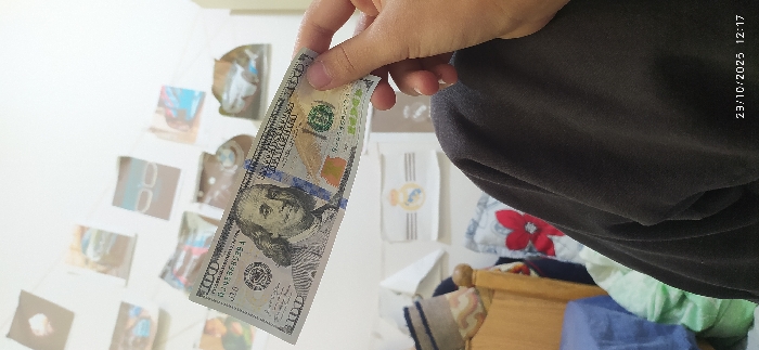 A human hand, with light skin tone, holds a single U.S. 100-dollar bill horizontally in the upper-center of the frame. The bill's obverse side is visible, displaying Benjamin Franklin's portrait and the serial number GJ45368529A, with a blue security ribbon running vertically through it. The lower half of the image features the person's lap, covered in dark gray or black casual fabric, indicating they are likely seated. The background consists of a plain white wall adorned with several small, rectangular photographs or printed images strung horizontally. Below the dollar bill, a white banner or poster featuring the emblem of the Real Madrid Football Club is visible. To the far left, a section of a wooden bed frame, a striped pillow, and a light blue sheet or blanket are partially visible. Below the banner, a patterned pillow or fabric with red floral motifs on a white background is present. A digital timestamp "23/10/2025 12:17" is overlaid on the bottom right corner of the image. The specific location within Rukn ad-Din Municipality, Syria, cannot be determined from the visual evidence in the image.