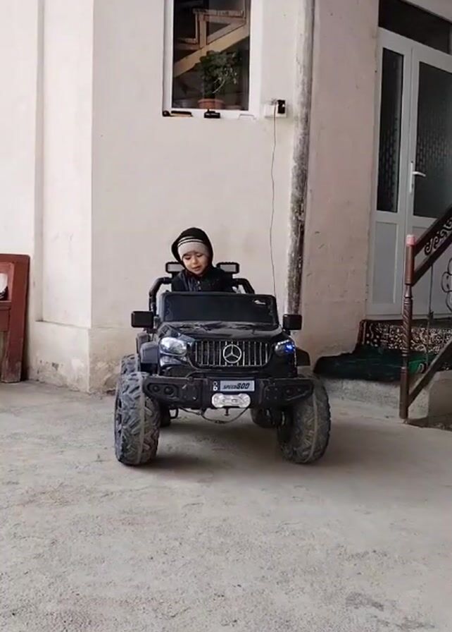 - "A young child dressed in black, including a hooded jacket and beanie-style hat, is driving a black electric ride-on toy car, designed to resemble a Mercedes-Benz G-Wagon, on a concrete surface in what appears to be a covered patio or carport" by FM-F7Esh2, licensed under CC BY 4.0