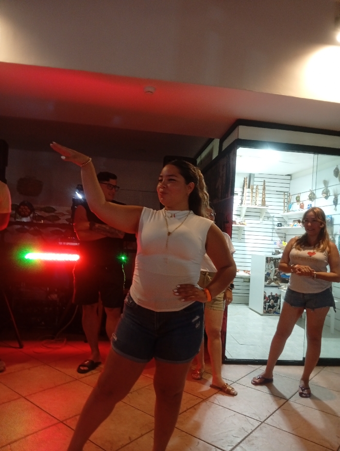 This image depicts an indoor scene in Playa El Agua, Venezuela, likely a social gathering or recreational event