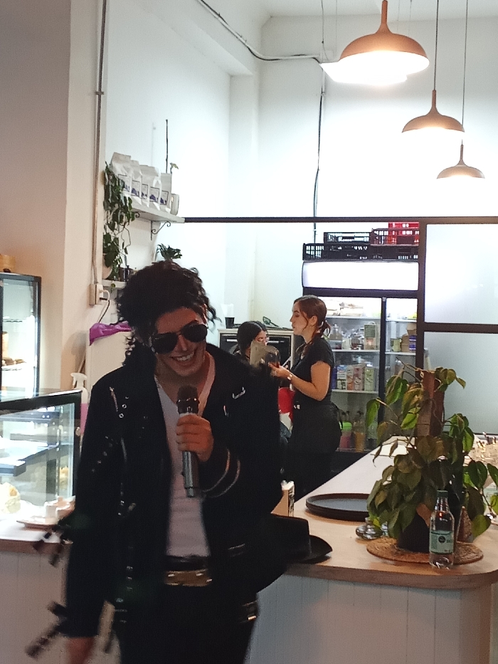 Inside a brightly lit cafe, a person dressed as Michael Jackson in a black jacket, white shirt, and sunglasses holds a microphone and smiles