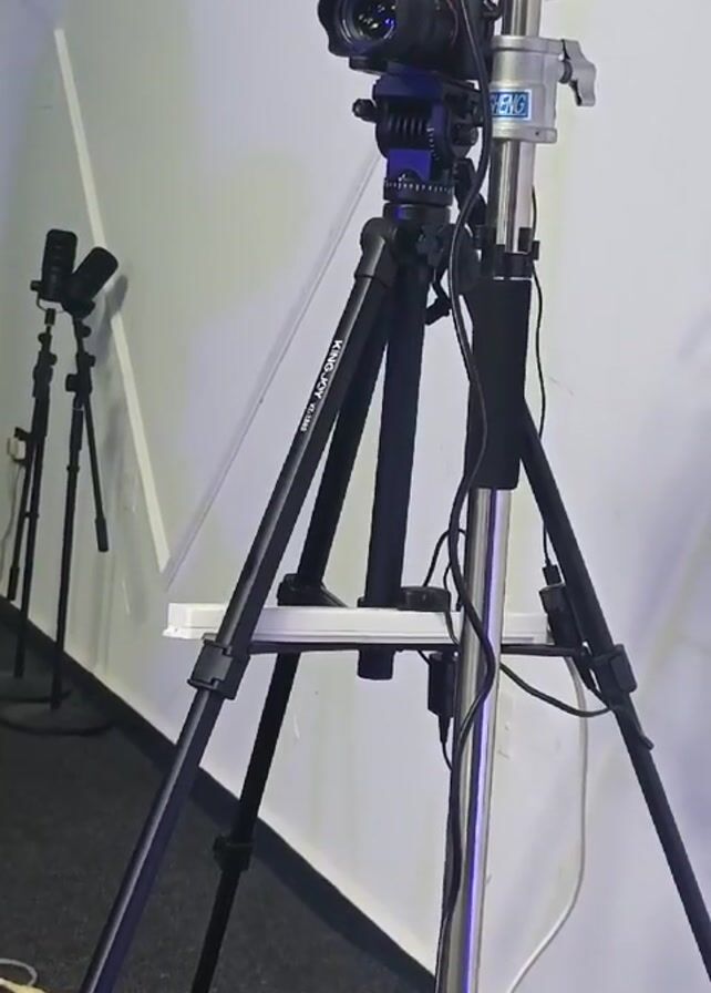 A black camera is mounted on a tripod in a room with white walls. There is a steel pipe attached to the tripod. Another camera is mounted on a tripod in the background.