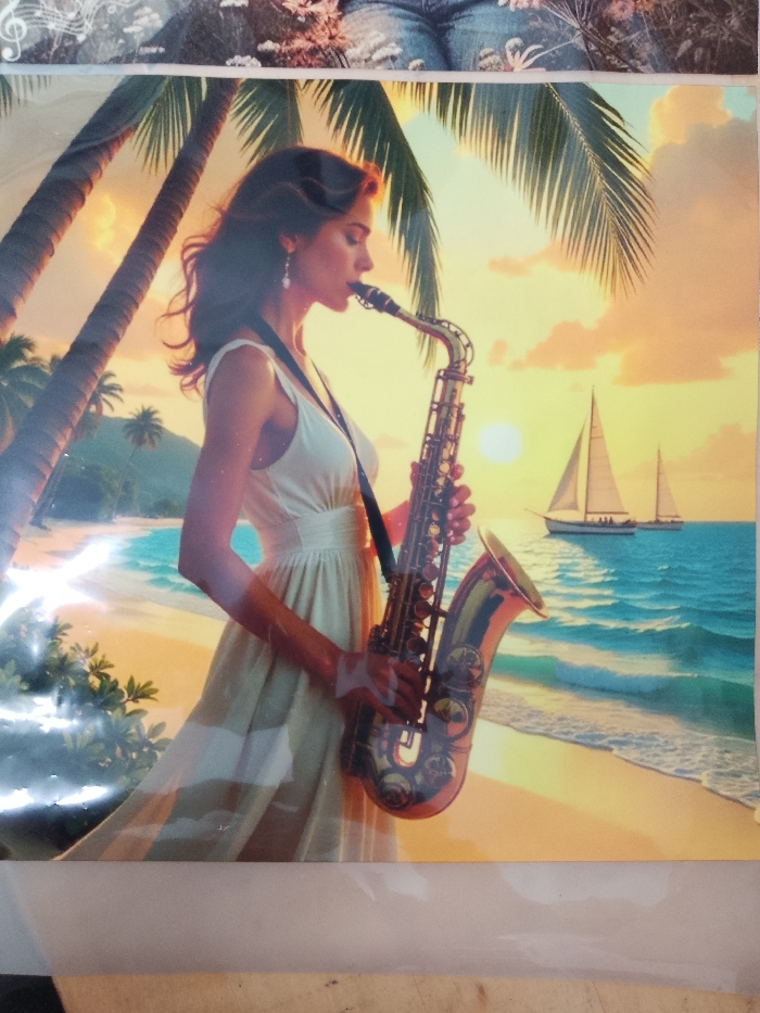 This image is a photograph of an artwork, likely a print, observed in the city of Gorna Oryahovitsa, Bulgaria. The artwork depicts a tropical beach scene at sunset. A lone female figure is positioned in the foreground, facing right in profile, holding a brass-colored alto saxophone to her mouth as if playing it. She wears a light-colored, possibly cream or white, sleeveless V-neck dress and a single pearl-like drop earring is visible on her left ear. Her dark hair is styled down, partially obscuring her face. Behind her, large palm trees with green fronds are visible, framing the sunset-lit sky. The sun is a bright, diffuse orb situated low on the horizon, casting a warm, golden glow across the entire scene. The foreground features a sandy beach, with gentle waves from the turquoise ocean lapping at the shore. In the mid-ground, two sailboats with white sails are visible on the ocean surface. The environment is characterized by a clear sky, calm waters, and lush tropical foliage near the beach. The artwork's overall color palette is dominated by warm yellows, oranges, and blues.