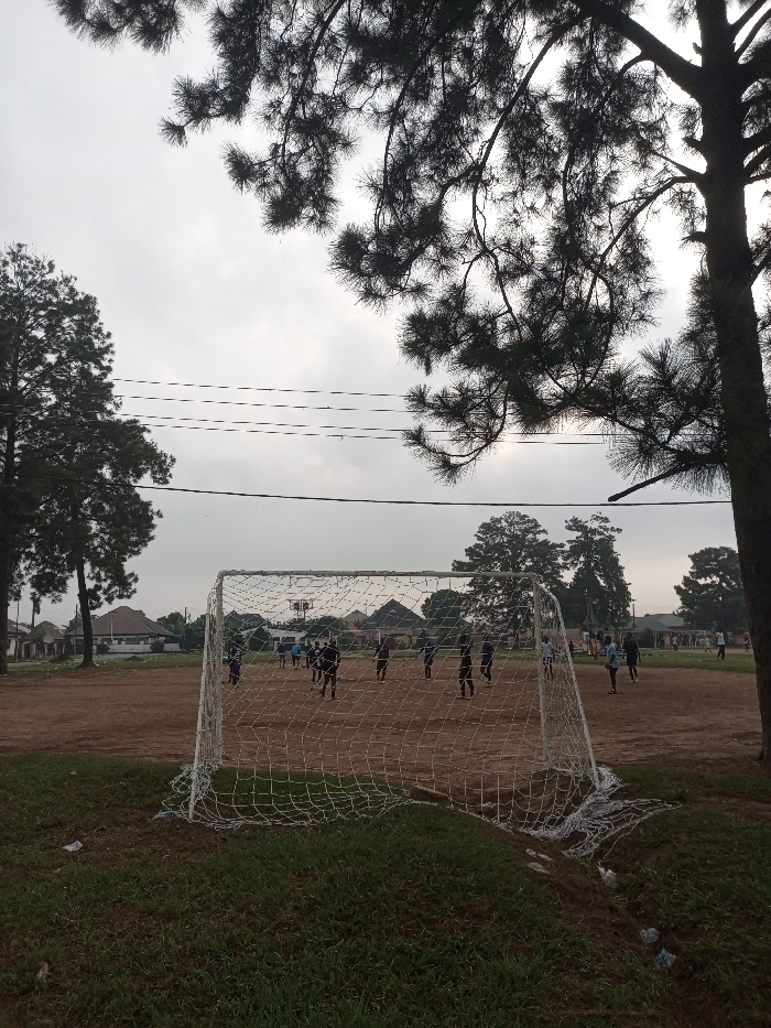 A soccer field under an overcast sky. A goal net is in the foreground, slightly damaged. Beyond it, a group of people are playing soccer on a dirt field. Trees frame the view, with a large pine tree dominating the upper right corner. Power lines stretch across the sky in the middle distance. Some houses are visible in the background. The foreground shows grass and a small area of debris near the net.