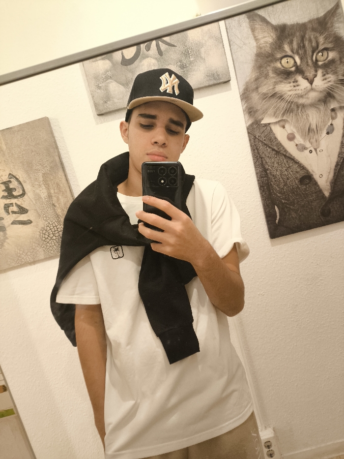 A male individual with light brown skin is depicted taking a mirror selfie in an indoor setting in Dresden, Germany. He holds a dark-colored smartphone, featuring multiple rear camera lenses, in his right hand, reflecting his image. He wears a black baseball cap with a tan brim and a gold 'NY' logo, a white short-sleeved t-shirt with a small black palm tree graphic on the left chest, and light-colored trousers. A black long-sleeved garment is draped over his shoulders. His expression is neutral, with eyes slightly narrowed, directed towards the phone screen. The background behind the reflection features a light-colored, textured wall adorned with three rectangular artworks: two with abstract or calligraphic designs in muted tones, and one prominent portrait of a grey anthropomorphic cat dressed in a suit and a beaded necklace. A white electrical outlet is visible on the lower right wall.