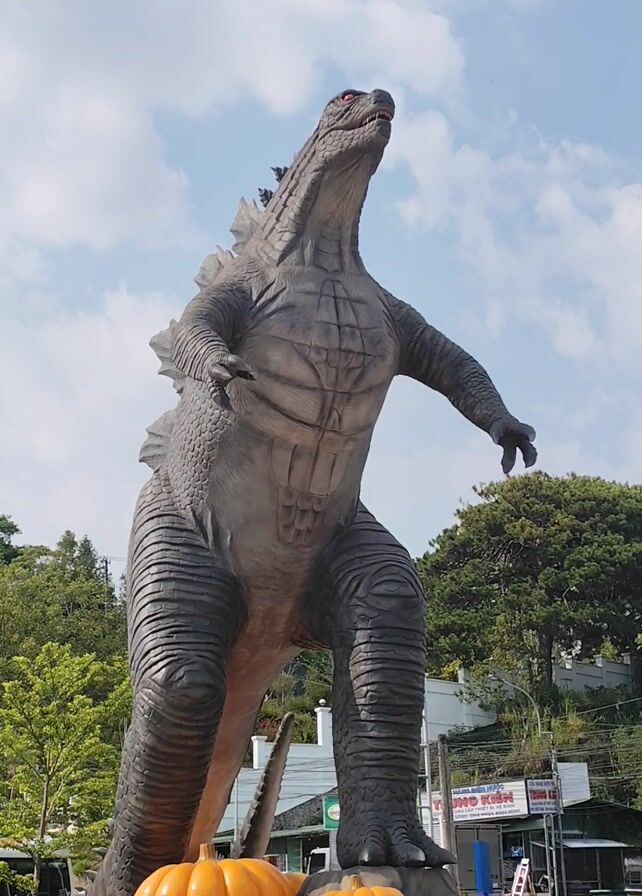 - "A low-angle shot reveals a Godzilla statue rendered in shades of gray and brown, set against a blue sky with scattered white clouds" by FM-yj6ly1, licensed under CC BY 4.0