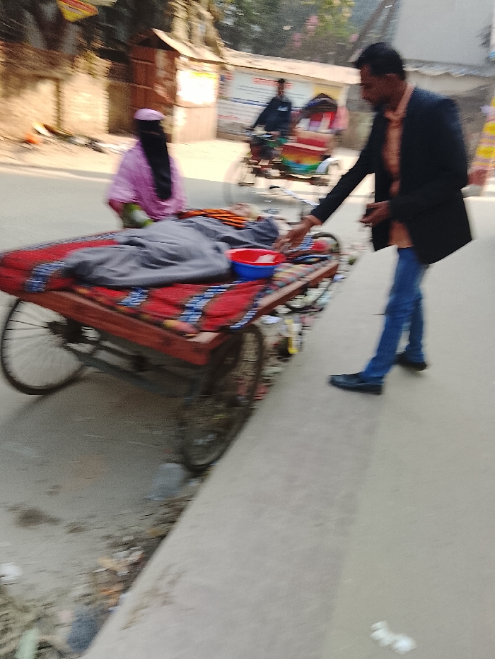 A person lies on a makeshift wheeled bed with a red and blue mattress, covered by a gray cloth. A red and blue bowl sits nearby. A woman in a pink robe and black niqab stands beside the bed. A man in a blazer and jeans reaches towards the person on the bed. Behind them, a man drives a colorful rickshaw. The scene unfolds on a street in what appears to be a developing country. The photo is slightly blurry.