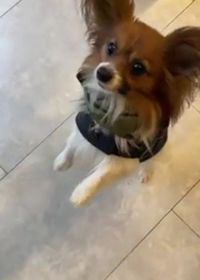 Here is a brief description of the video: The video shows a small dog sitting on a tiled floor wearing a black vest. The dog is light brown and white, with large, butterfly-like ears. A person is standing in front of the dog. The person gives the dog a piece of popcorn. The dog catches the popcorn in its mouth.
