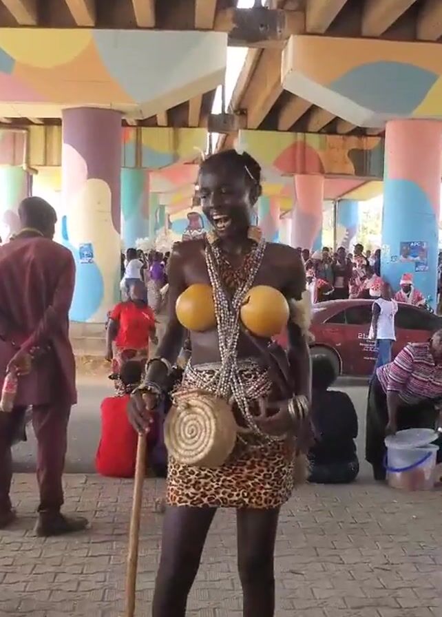 person dressed in traditional attire, possibly for a cultural event, standing under an overpass. The overpass is painted with bright colors. The person is wearing a short leopard print skirt, beads, and what appear to be gourds covering their chest. They are holding a walking stick and have woven baskets on their waist. The setting appears to be a public space with many other people present in the background, some sitting, some standing, and others walking. The environment suggests an outdoor gathering or festival-like atmosphere.