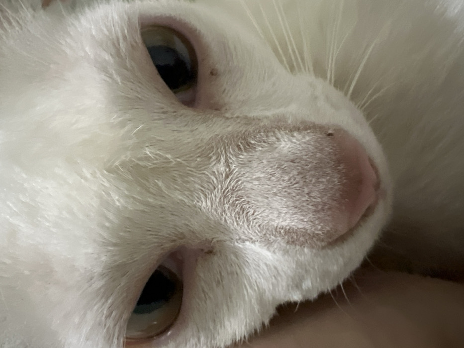 A close-up, head-on forensic image depicts the face of a domestic cat in Cam Đức, Vietnam. The cat possesses white fur and prominent light brown irises with vertically oriented, dark pupils, conveying an intense gaze directed towards the viewer. Its pink nose is clearly visible at the center, with subtle dark spots present on the bridge of the nose and below both eyes. A faint suggestion of white whiskers extends from the right side of the muzzle. A blurred, dark, undefined object, possibly a human hand or finger, is partially visible on the lower left side, suggesting an interaction. The background is indistinct and dark, indicating an indoor or low-light environment.
